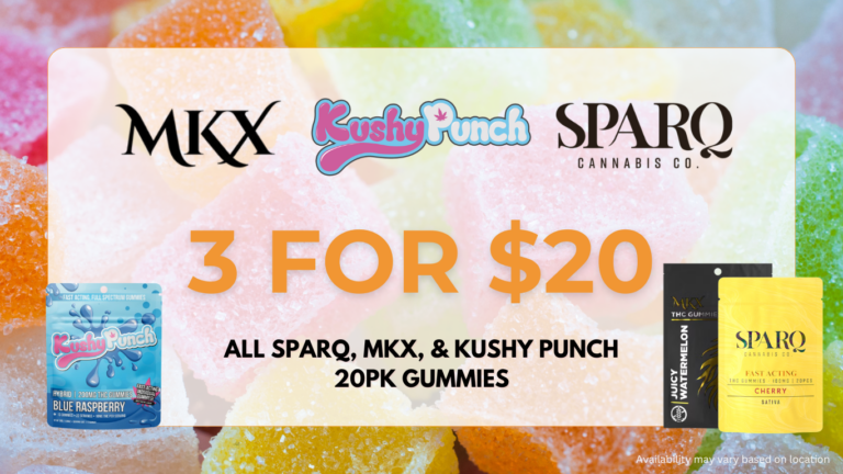 3 for $20: All Sparq, MKX, and Kushy Punch 20pk Gummies – Availability may vary based on location