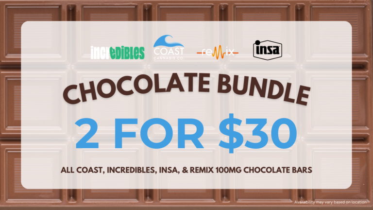 2 for $30: COAST, Incredibles, Insa, and Remix 100mg Chocolate Bars – Availability may vary based on location.